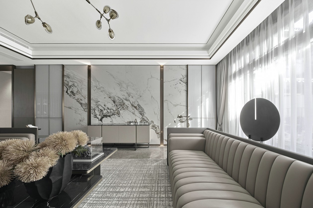 陽(yáng)光透過(guò)輕紗,從庭院外灑滿整個(gè)客廳。質(zhì)感細(xì)膩的大白花大理石將山色湖光的片刻靈動(dòng)擲于墻上,搭配地面宛若水波般機(jī)理延綿的意大利灰大理石,以及氣質(zhì)清傲的啞光質(zhì)感染色銀檀木,一幅融合了現(xiàn)代皴法的寫(xiě)意山水,在客廳悄然渲染而開(kāi)。置身其間,悠然畫(huà)上,時(shí)而獨(dú)自清凈,時(shí)而天倫之樂(lè)。落地窗外,庭景依舊,四季螺旋更迭。