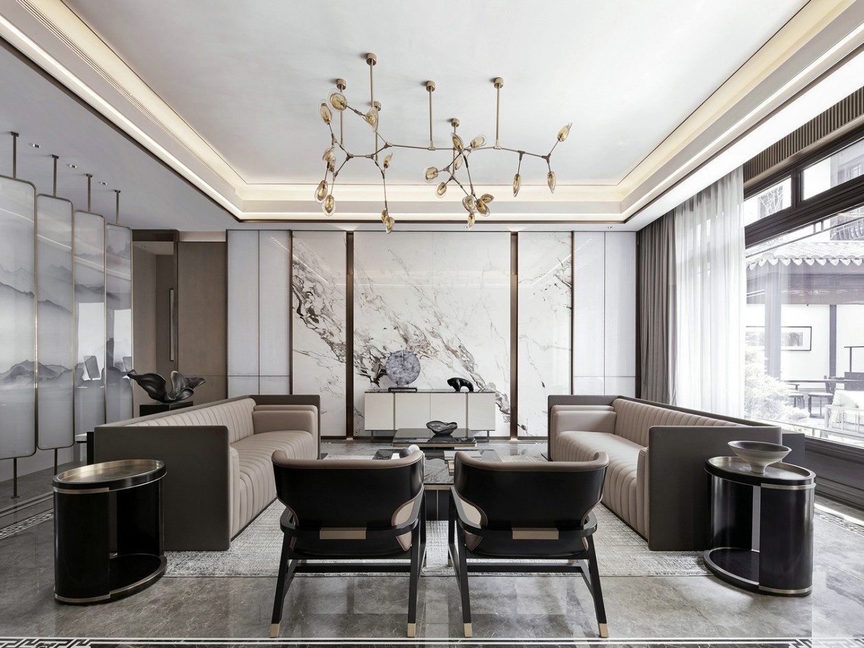 家裝設(shè)計(jì)客廳裝修效果圖,新中式風(fēng)格室內(nèi)家裝設(shè)計(jì),為這種期許覓得一方歸屬,在和風(fēng)細(xì)語(yǔ)的江南為疲累的靈魂尋得一處依附。詩(shī)語(yǔ)翛然,在空間中描畫(huà)山湖云影,清雅而恬靜。
