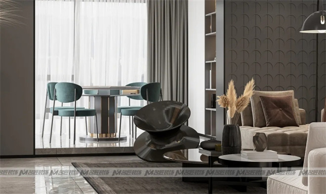 別具一格的客廳設(shè)計,突破以往設(shè)計的傳統(tǒng)界限,構(gòu)筑了一個大方而獨特的空間。沙發(fā)背景墻采用帶有立體感的深灰色硬包拼接白色墻面,咖色絲絨沙發(fā)拼接白色布藝沙發(fā)與之銜接,在不同材質(zhì)的碰撞下,明與暗的對比下,達到空間錯落有致的視覺感以及層次感。壁爐里的熊熊火焰,讓身心與視覺融起暖意。想象在寒冷的冬日里,在火光的映照下,與家人看一部電影,聽時光緩慢流淌的聲音,這該是多么享受的事情。