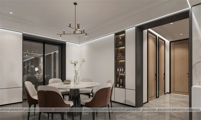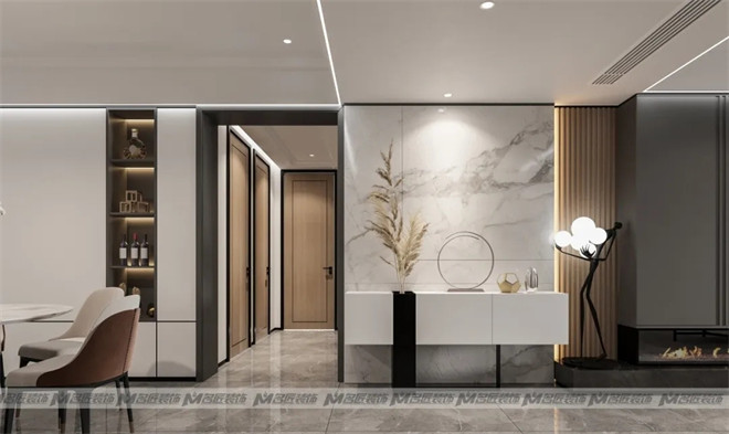 設(shè)計師巧妙的布置一組白色的玄關(guān)柜,擺上極具藝術(shù)感與美感的現(xiàn)代擺件作為裝飾,金銀交匯,空間精致感迎面而來,讓人迫不及待地想入室一探究竟!