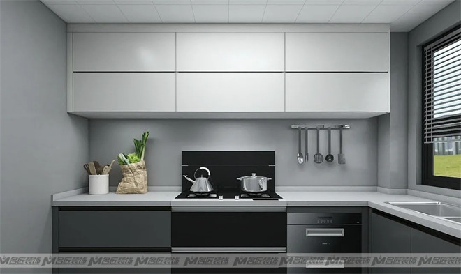 廚房內(nèi)部做了L字型的布局方案,讓廚房擁有更多的儲物空間,功能分區(qū)有所側(cè)重,比較靈活多變。白色吊柜與深灰色櫥柜承上啟下,延續(xù)空間深淺搭配的風(fēng)格,不顯單一枯燥。