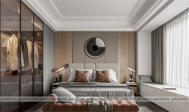 主臥的床背景是木飾面+咖色硬包拼接,并以充滿設(shè)計感的立體掛飾作為點綴,增添了時尚感。床頭兩側(cè)造型前衛(wèi)的臺燈,簡潔不失創(chuàng)意,與臥室風(fēng)格渾然一體。