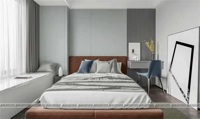 次臥的設(shè)計顯得素雅干凈,淺綠色的床背景點亮我們的視線,在感官上追求自然與靜謐,體驗內(nèi)斂高級的品質(zhì)棲居。