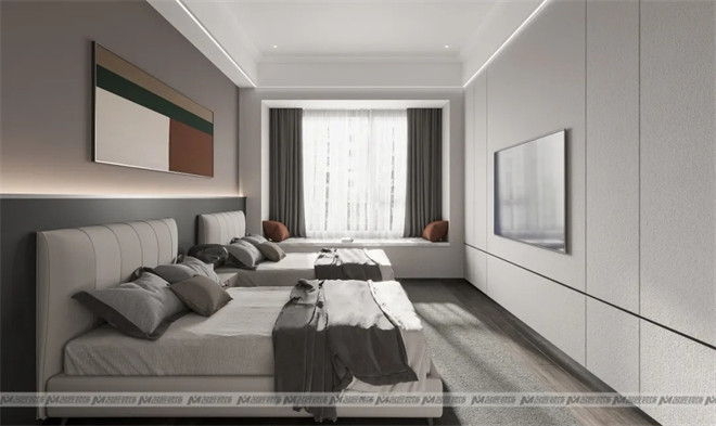 兒童房采用現(xiàn)代化的榻榻米+書桌+衣柜的一體化多功能設(shè)計,既能滿足孩子休息、學(xué)習(xí)、娛樂及收納的基本要求,又保持了整體風(fēng)格的一致,美觀實用。