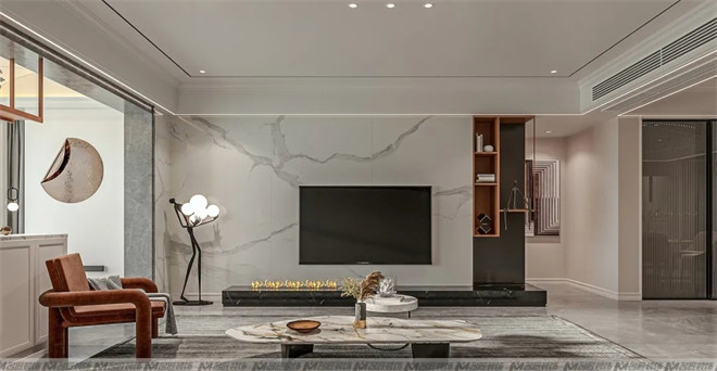 客廳空間簡潔大方,米灰色的布藝沙發(fā)散發(fā)著溫馨的味道,三色抱枕點綴其中,并與地毯、毛毯、單人椅的顏色相呼應(yīng),隨意又充滿設(shè)計感。大理石材質(zhì)的電視背景墻及茶幾,帶來輕奢質(zhì)感的視覺享受,提升空間的檔次。