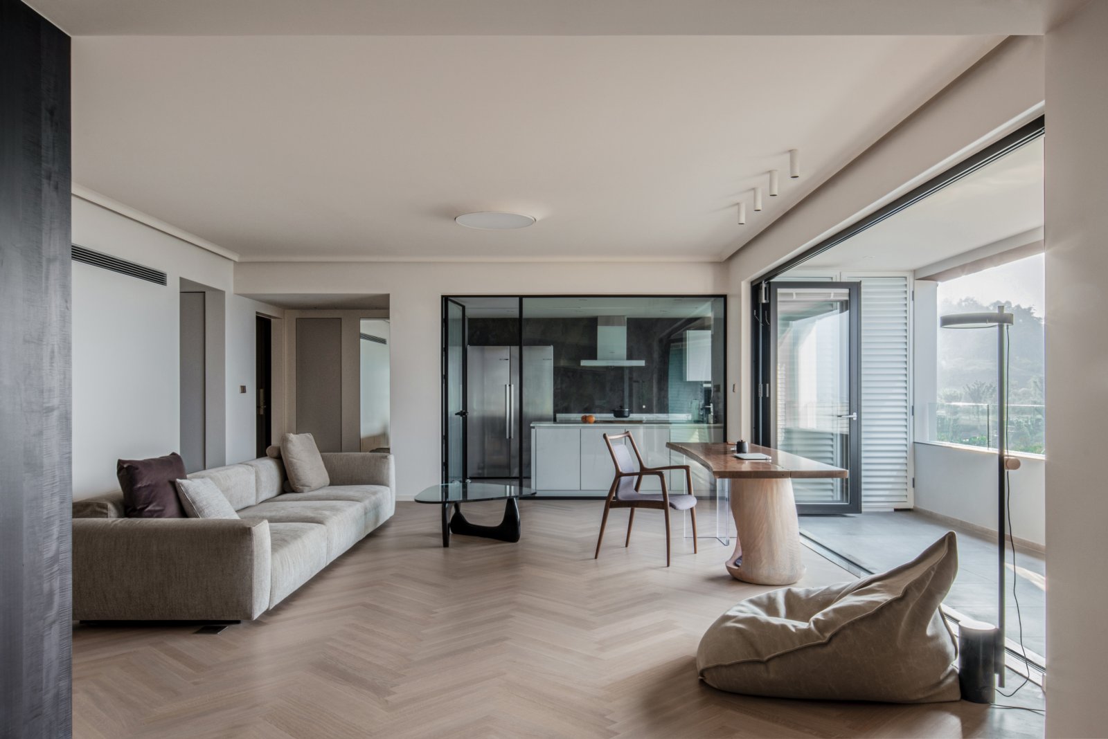 室內(nèi)客廳裝修效果圖,大的落地窗為客廳帶來了充足的自然光線,簡約的白色布藝沙發(fā),舒適清爽