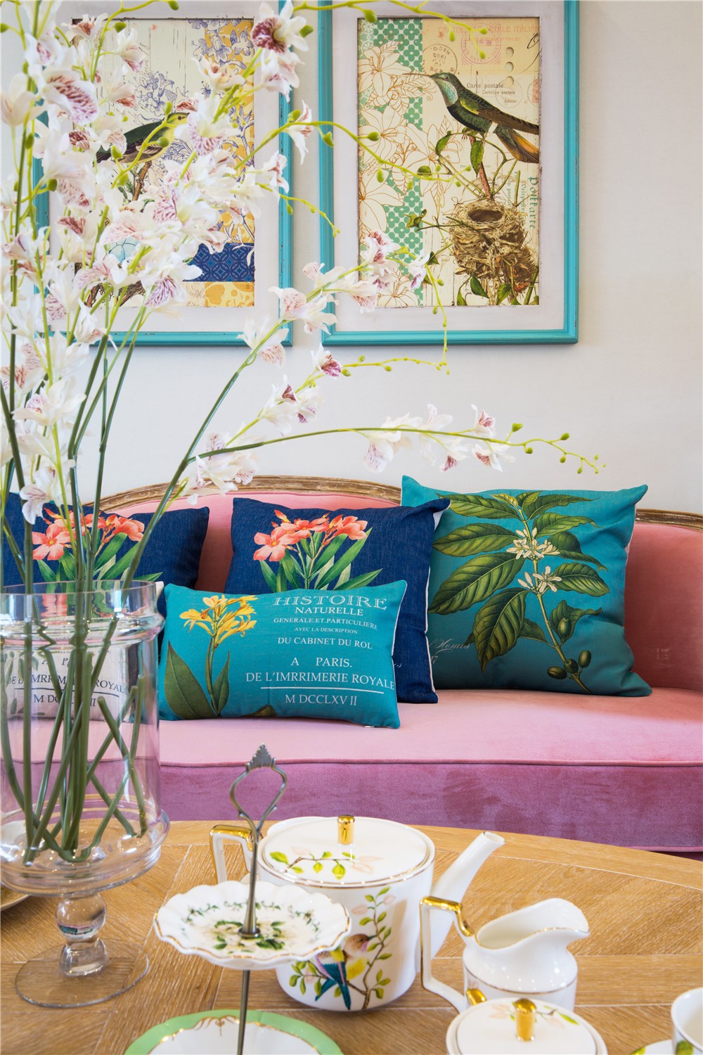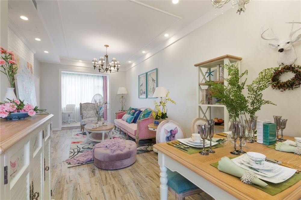 室內(nèi)客廳裝修效果圖,整個客廳選擇了簡歐簡潔,選線條圓潤,色彩豐富,用了自然綠和深藍來緩沖粉色沙發(fā)的跳躍感。