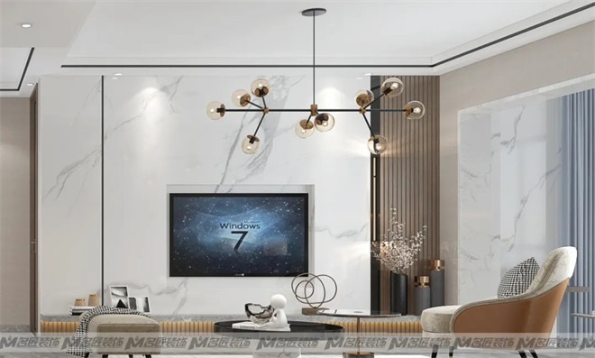 大理石電視背景墻,絲絨質(zhì)地的沙發(fā),輔以窗簾、幾何掛畫(huà)、圓形邊幾、擺件等軟裝搭配,不同材質(zhì)之間相互碰撞,又相輔相成,畫(huà)面一派和諧。