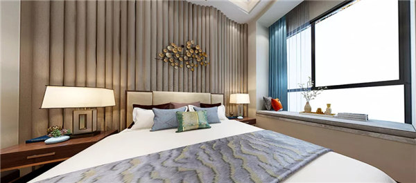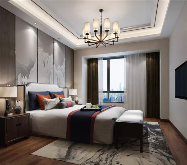 臥室色彩比較沉穩(wěn)低調(diào),在用色上偏向舒緩、雅致,整體簡潔而不失優(yōu)雅。新中式燈具色彩鮮明,光線柔和,給人一種溫馨、寧靜的感覺。