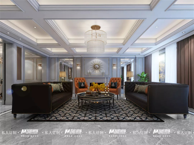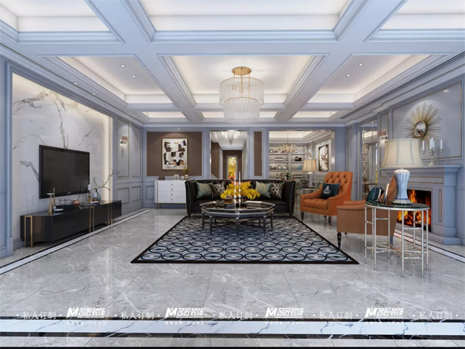 客廳圍繞美式輕奢風(fēng)格,突出都市、時(shí)尚、小資的氛圍打造,不同于傳統(tǒng)美式,更強(qiáng)調(diào)輕奢的格調(diào)。