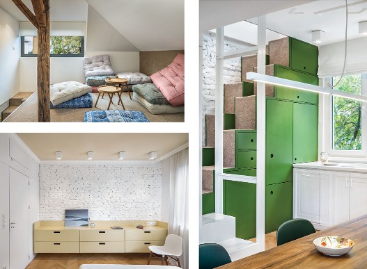 這是一間位于保加利亞的公寓,從結(jié)構(gòu)、模式甚至是顏色來(lái)看,這間公寓似乎比較單調(diào),很難找到出彩之處??蛷d里,最搶眼的也只不過(guò)是一張青綠色的普通沙發(fā),還有一"盞"頗具創(chuàng)意的吊燈。整個(gè)空間色調(diào)都是綠自搭配,綠色給人清新舒暢的感覺(jué),而白色則像純真潔凈的微笑那般干凈。其實(shí),公寓是一個(gè)開(kāi)放性的大房間,沒(méi)有門(mén)或者隔板,卻把每個(gè)空間都劃分完整;綠色的閣樓樓梯,看似是—個(gè)個(gè)收納柜,但設(shè)計(jì)師把廚房的電器都藏在樓梯柜里,省略了空間位置,又美觀實(shí)用;更隱秘的是,在卡其色書(shū)柜的后面是一個(gè)書(shū)房,而白色書(shū)柜后面則是一個(gè)單獨(dú)的臥室。空間簡(jiǎn)而不單,打破常規(guī)設(shè)計(jì),結(jié)合空間的地理特點(diǎn),給平凡的生活制造點(diǎn)驚喜。